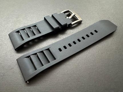 This custom made 12 inch long nylon zulu strap has over 5 inches of sizing holes. The longer length and extra sizing holes make these zulus able to fit a wider range of wrist sizes. They can be cut down for smaller wrists. This black zulu has a grey stripe, black coated stainless steel rings, and is marked STEVRAL on the buckle ring.