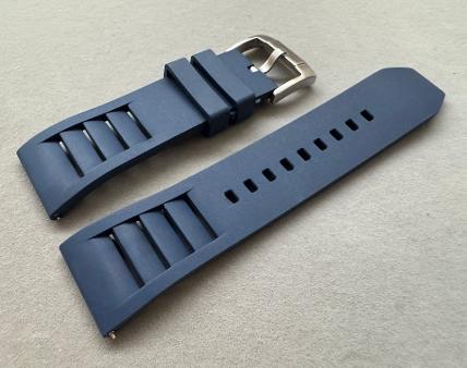This custom made 12 inch long nylon zulu strap has over 5 inches of sizing holes. The longer length and extra sizing holes make these zulus able to fit a wider range of wrist sizes. They can be cut down for smaller wrists. This black zulu has a blue stripe, black coated stainless steel rings, and is marked STEVRAL on the buckle ring.